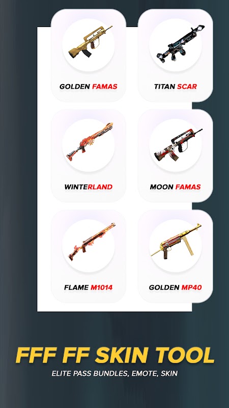 FFF FF Skin Tool is a simple app that allows users to entertain by getting Elite Pass Bundles, Emotes & Gun Skins for entertainment. This unlimited free Diamond earning app is easy to use and you can get elite pass & diamonds. We made free diamonds giveaways on daily basis.