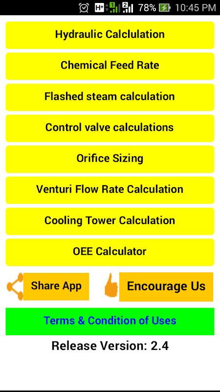 應用程序為您提供了用於各種計算的計算器,例如各種罐的體積,表面積,空重,靜水壓。它還提供閃蒸蒸汽計算,泵軸功率,管道流量計算,壓降,冷卻塔,閥門,節流孔等。