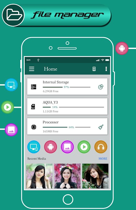 - Quickly view pictures, music, videos, applications, processes, downloads,bluetooth etc. by category.