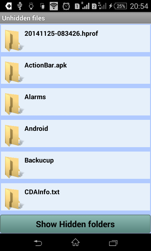 4.Long press on folder that you want to hide in Unhidden screen and also long press to unhide folder in Hidden list of folders.