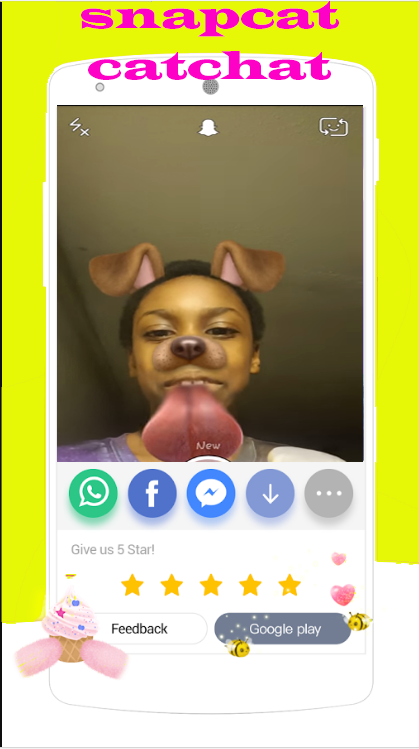 Create a snapcat catchat face camera face, cat face, rabbit face, rainbow, anime eyes, masquerade camera, emoji, tearss, snap text and more.