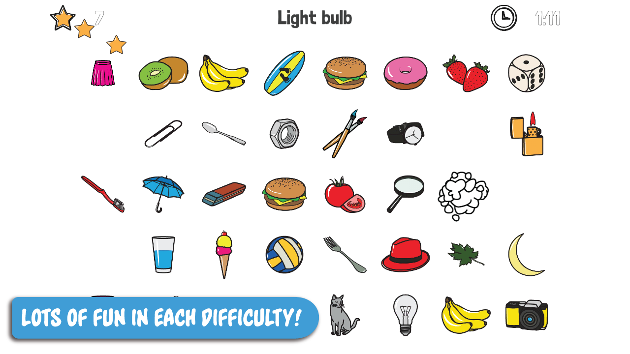 試試你可以在時間耗盡之前找到盡可能多的隱藏的對象!有樂趣和享受實物好看的塗鴉,而玩找對象!