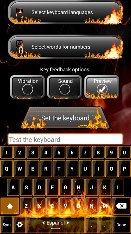 2.返回給應用程序,然後選擇鍵盤設置為默認按鈕,並選擇失火 鍵盤主題