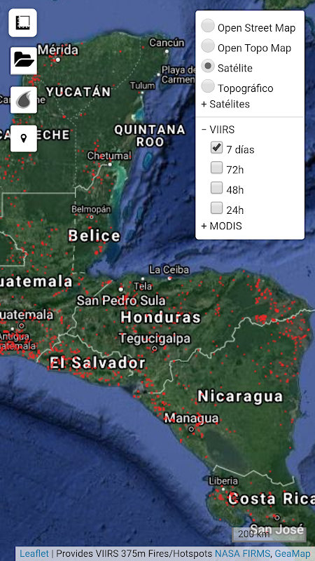 由美國開發的 NASA 資源管理火災資訊系統 (FIRMS) 可在中解析度成像光譜儀 (MODIS) 和可見紅外線成像輻射計 (VIIRS) 衛星觀測後三小時內近乎即時地發布活躍火災資料。 MODIS 是內建於 TERRA 和 AQUA 衛星的感測器,其解析度為每公里 1 個像素。搭載於 NASA/NOAA Suomi 國家極地軌道夥伴關係 (SNPP) 的 VIIRS 將空間分辨率提高到 375 米,並提供了更出色的夜間性能。