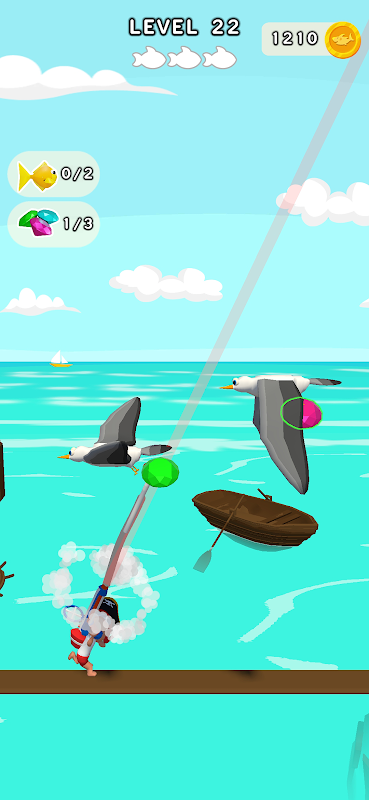 您將跳過島嶼,碼頭,輪船等等,以釣到魚類和珍貴的寶石。您也將從海鷗那裡抓到它們。海洋和天空是我們的!