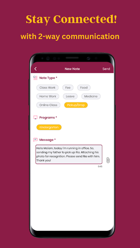家長與老師的溝通:您可以透過應用程式向老師發送任何請求或疑問,並可以根據需要附加照片、語音訊息或文件。例如,如果您在辦公室遲到了,需要派別人來接您的孩子,現在您不必擔心訪客的身分證。您可以直接在應用程式中將訊息發送給老師並附上他們的照片。老師回覆後您會立即收到通知。
