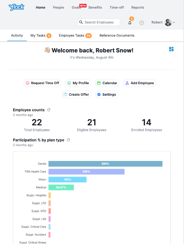 由於大多數員工花費不到一個小時來做出福利決定,我們讓分析和選擇福利對您的員工來說變得輕而易舉。 Flock 可幫助員工在幾分鐘內進行更改、查看保險範圍並為其健康和福利計劃註冊。