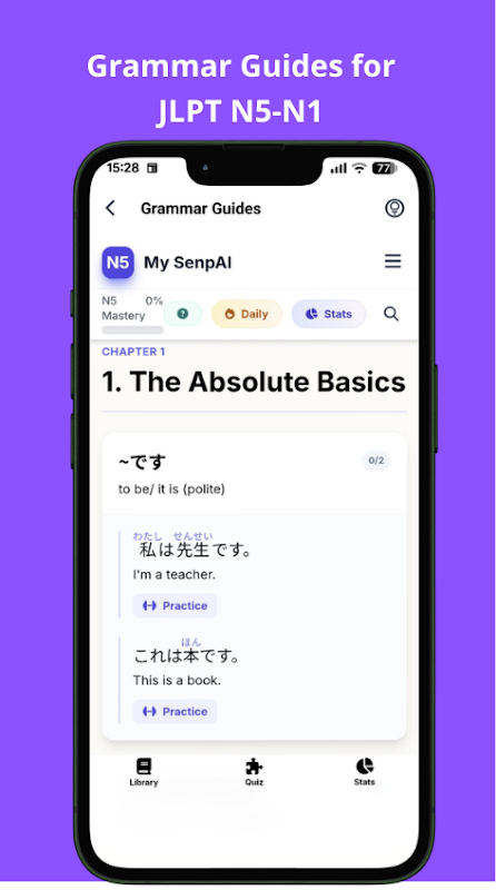 • JLPT 語法指南 N5-N1——包含所有語法模式,配有母語音訊和 SRS 追蹤功能。