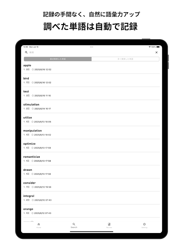 您查找含義的次數以及上次搜尋的日期和時間都會自動儲存,因此無需費心將其記錄在詞彙筆記本中。
