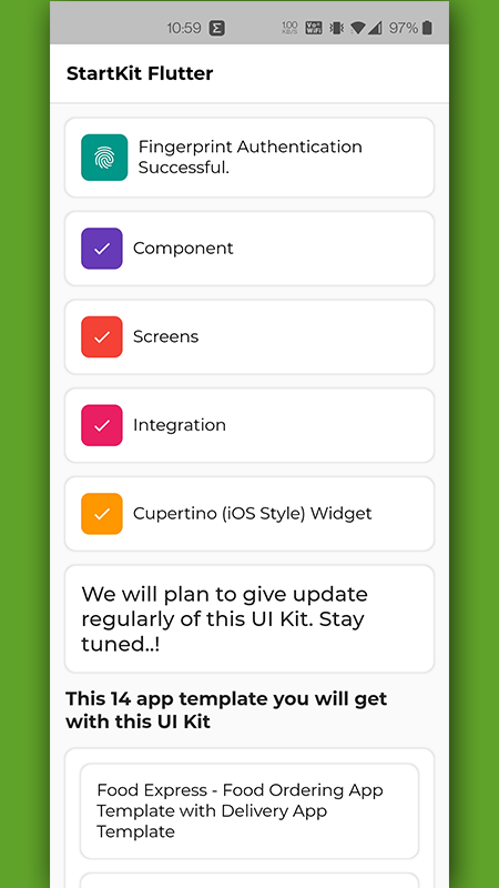 StartKit是一個不穩定的UI套件。在此ui工具包中,所有組件,屏幕設計,集成,Cupertino小部件和14個完整的應用程序模板均可用。像底部導航欄,底部工作表,抽屜,下拉菜單,複選框,加載程序,登錄設計,配置文件屏幕,提要設計,聊天屏幕設計等。