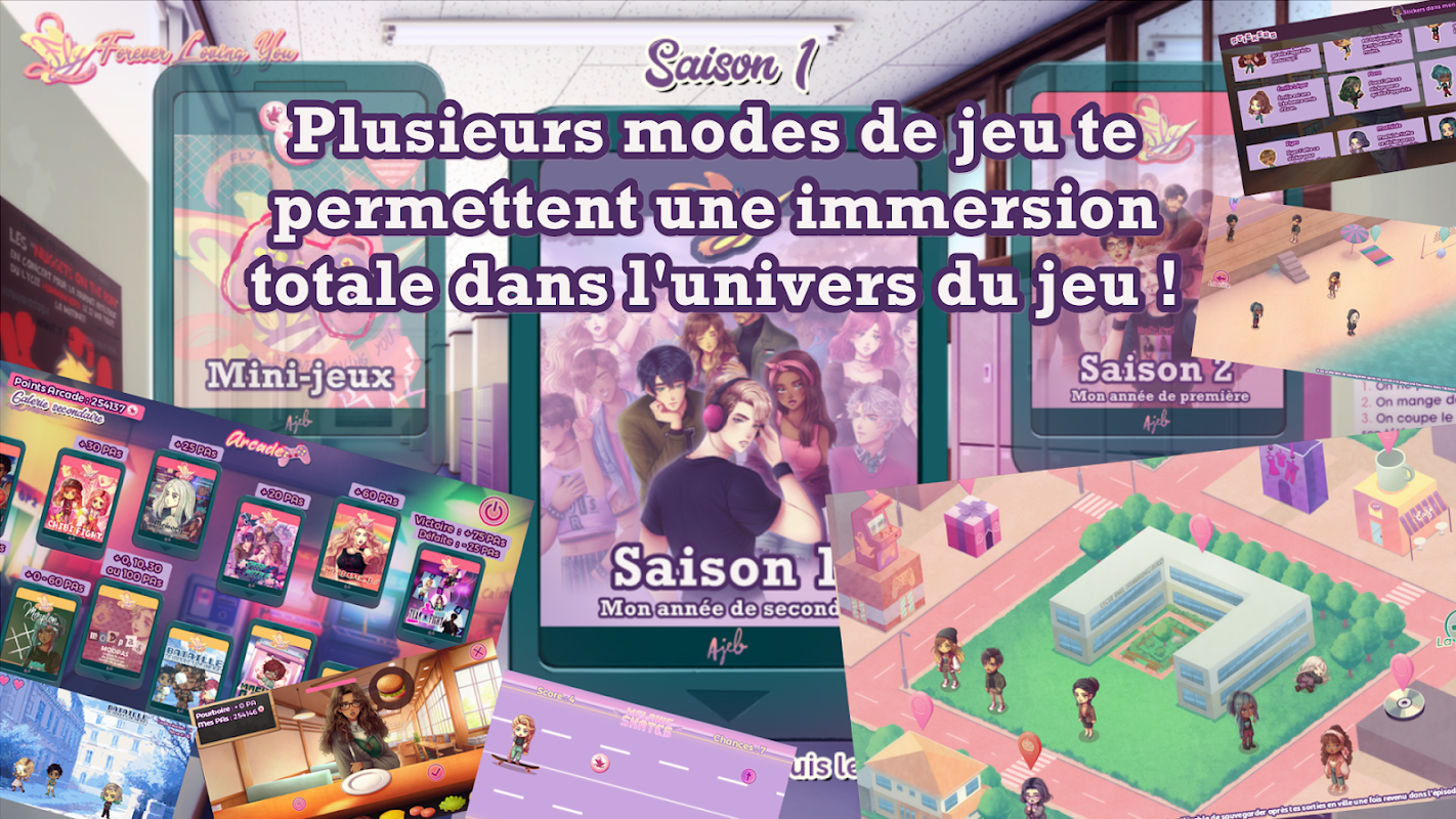 與同類型的其他遊戲(章節、章節、甜蜜愛、Is it Love 等)一樣,《FLY:永遠愛你》的靈感源自日本乙女遊戲,並將你帶入一個你可能更熟悉的場景:法國高中的走廊。重點在於自訂(主角,以及部分同學!)