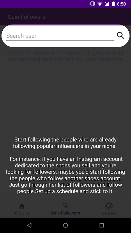 -Search for users in the same category as your account and auto follow this user's followers(Gain followers)
