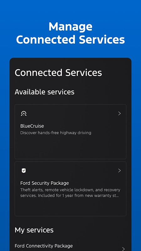 · 互聯服務:啟動可用的試用版、購買套餐或管理 BlueCruise、福特互聯套餐和福特安全套餐等服務。