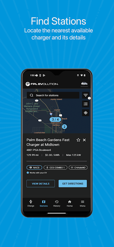 FPL EVolution® 正在將整個佛羅裡達州的電動車充電站數量增加 50%,並在主要走廊沿線建立一個長達 800 英里的通用快速充電樁網路。下載 FPL EVolution 應用程式以尋找並導航至最近的 FPL EVolution 充電器並開始充電。該應用程式可供 FPL 客戶和客人使用。