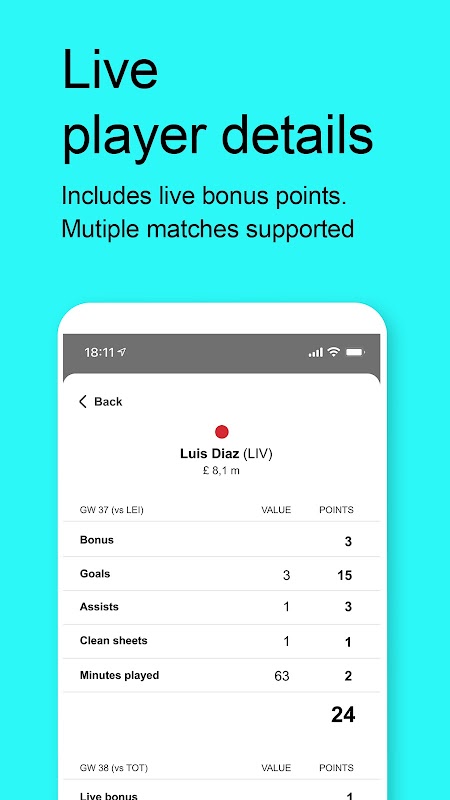 在比賽進行時查看即時 FPL 積分、獎金和小聯賽排名。