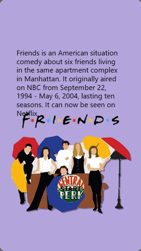 該應用程式會向您展示所有《老友記》角色,當您點擊某個角色時,會彈出該角色的信息,讓您探索並了解情景喜劇《老友記》中的角色。