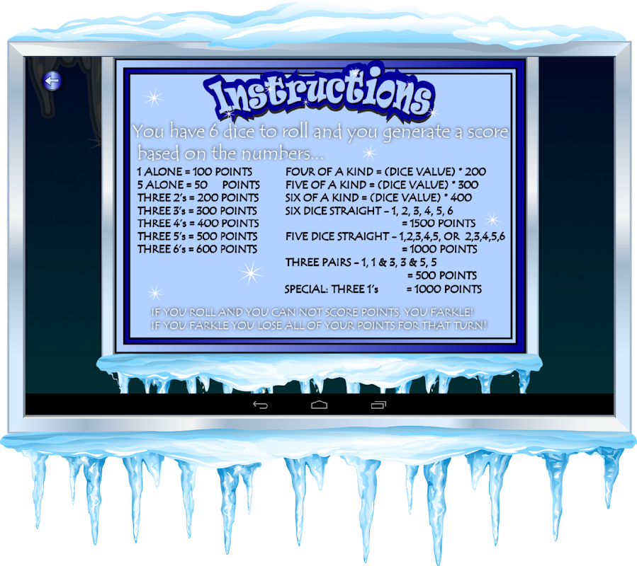 Experience this special edition version of Farkle where the ice has taken over the kingdom! The aim is simple! Roll the ice dice and try to gain the highest scores based on the numbers you roll! But be careful! If you can't score any points then you FARKLE and lose your points, freezing you off of the scoreboard if you aren't too careful.