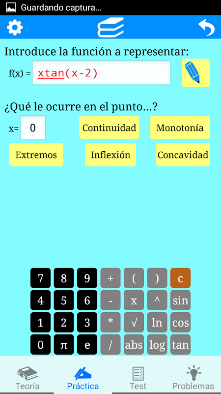 - Práctica: permite la representación gráfica de cualquier función introducida, así como comunicarnos si es continua en un punto, si es creciente/decreciente o cóncava/convexa en él, o si éste es objeto de un máximo/mínimo/punto de inflexión.