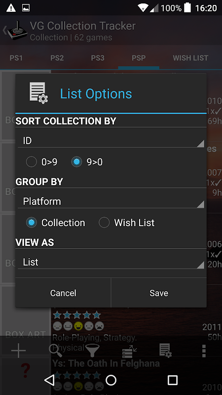 VG Collection Tracker is an advanced video game collection organizer, designed for smartphones (not yet for tablets). It lets you view your games offline on the go or check which games you have when shopping, so you don't buy the same game twice.