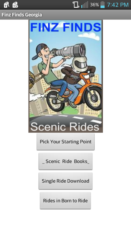 A companion application for the bestselling motorcycle map book, Finz Finds Scenic Rides in Georgia, written by Steve Finzelber. Using this application motorcycle riders will be taken to the starting point of each scenic route from the book. Georgia is known for peaches but we believe that there are scenic roads with views that will leave you wanting more. The scenic motorcycle back roads are calling, what are you waiting for?