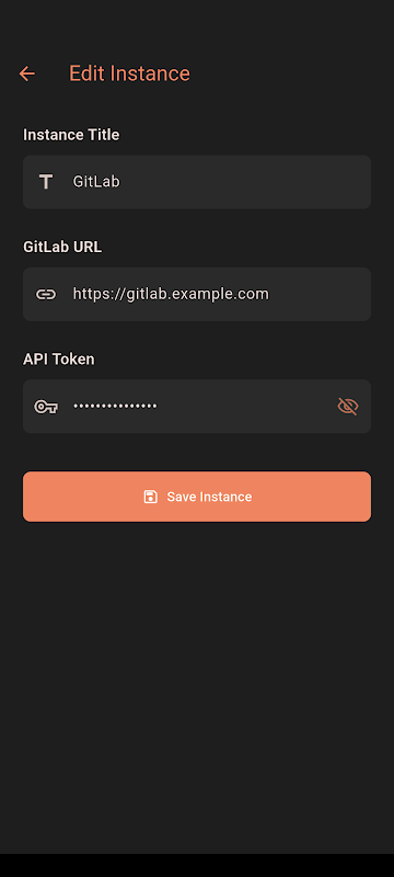 - Add multiple GitLab instances - Edit existing instances to update connection details - Swipe-to-delete with confirmation dialog for safe removal - Clean, intuitive interface for managing your GitLab infrastructure - All your data stays on your device