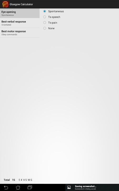 The application works as a calculator for Glasgow Coma Scale. The GCS is a neurological scale that aims to give a reliable, objective way of recording the conscious state of a person for initial as well as subsequent assessment.
