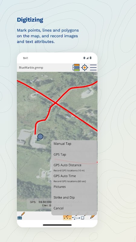 Global Mapper Mobile 可以顯示從桌面版本軟體傳輸的向量、柵格和高程資料圖層。它還提供使用預先配置屬性和選項清單進行繪圖、追蹤和基於表單的資料收集的工具。