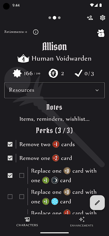 使用數字字符表跟踪多個角色的進度,或使用增強計算器輕鬆計算卡片增強的成本,該計算器提供有關每個增強、相關成本和成本的各種修改器的詳細信息。 Gloomhaven 和 Frosthaven 規則的選項,以及對新的“臨時增強”變體規則的支持。