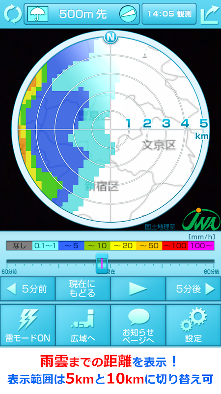 您可以看到過去60分鐘到每5分鐘60分鐘之間的雨雲運動。