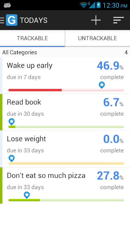 「追蹤目標」是一個使用者界面友善、免費的追蹤目標應用程式,幫助您達成生活中的目標如運動、減重、戒掉換習慣、看書和背單字等等。您可以使用追蹤目標來訂定一段時間的計畫,設定鬧鐘提醒登記進度,並定期使用日曆或圖表回顧完成度。