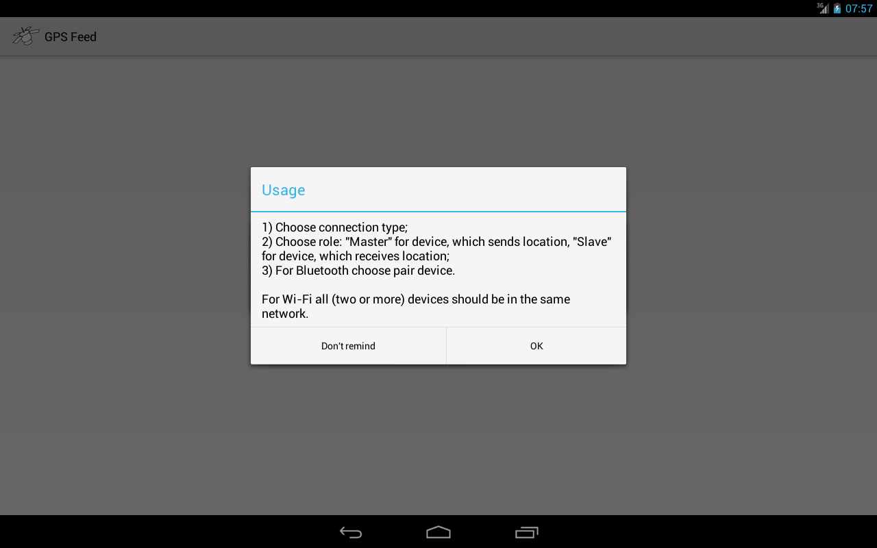Application allows you to emulate location data on devices even without hardware GPS module, using data from another, transfered by different ways.
