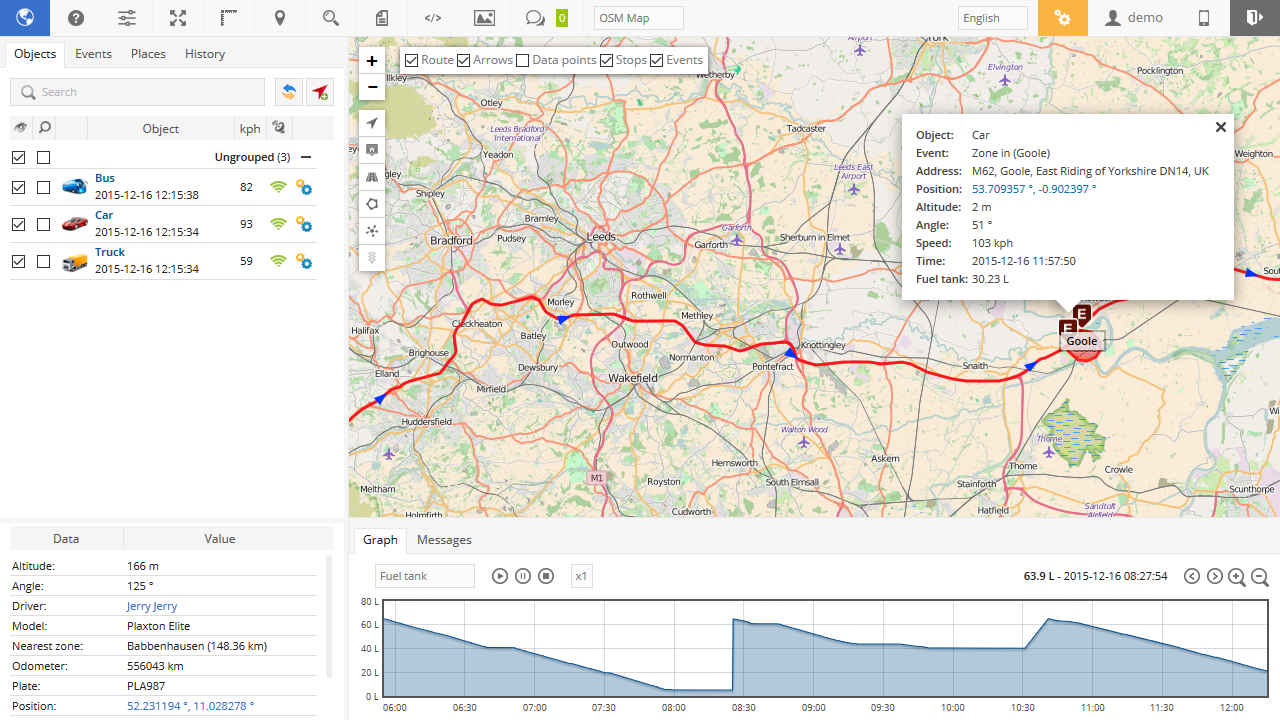 - 您的軌跡歷史可以與附加信息一起放在地圖上,例如時間/速度圖、停靠點、報告等。還可以為您的對像生成組報告。