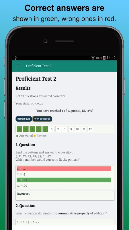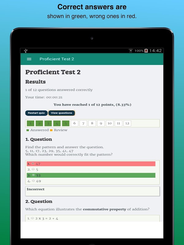 Correct answers are shown in green, wrong ones in red. When your answer was wrong the correct one is displayed. In some cases hints are given, that might be helpful for the future, just like the path you have to follow when solving mathematical tests.
