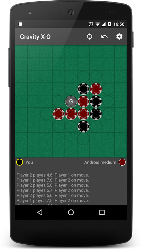 目標是有連續4相同的球(水平,垂直或對角線)。加,是有限制的,新的球只能放在上的自由字段是旁邊先前放置的球,因而有“重力”在它的標題。