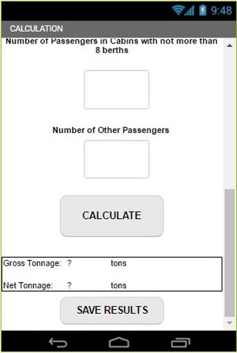 This apk simply calculates gross tonnage & net tonnage of a ship or floating platform. When you enter required volumes and other necessary data, it calculates the tonnage values. You can save and store calculated data to your phone. Naval architects, marine engineers, inspectors,surveyors and who related to marine sector can benefit and reduce calculation time.