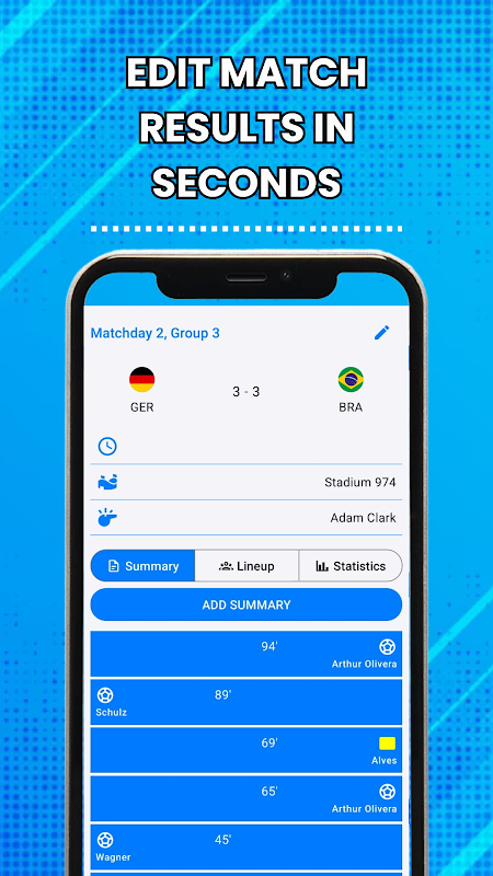 全面掌控統計:進球、紅黃牌、助攻等。查看球員、球隊、裁判和球場統計數據。在一個平台上管理比賽日程、場地和裁判指定。