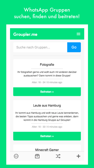 Auf Groupler Suchst, Findest und Gründest du WhatsApp Gruppen so einfach wie nie, lernst neue Leute und Kontakte kennen mit genau deinen Interessen. Täglich hunderte neue Gruppen und selbst wenn du keine finden solltest die dir gefällt, gründe doch einfach eine eigene, auf Groupler.me und in unserer App.