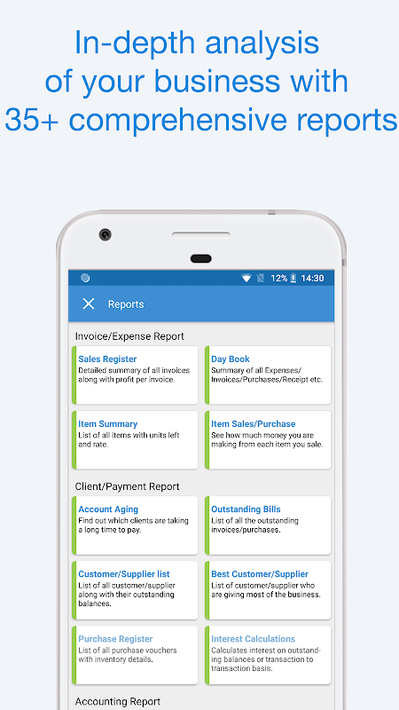 簿記員會計是用於中小型企業的企業會計應用。它支持GST,VAT等稅收。它的簡單用戶界面使您可以發送發票,賬單和預算,跟踪費用和收據,管理庫存,查看每日交易賬簿,查看並發送各種財務報告和多得多。它還支持在所有設備上進行數據同步的無縫同步。