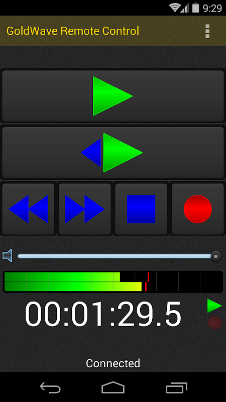 Start playback and recording remotely in GoldWave using this free app. This is not a stand-alone recording program. It is a remote control program for GoldWave. A licensed copy of GoldWave v6.16 or later is required. Controls include Play, Stop, Rewind, Fast Forward, Skip Back, and Record. Adjust the playback volume and see real-time VU meters on your device. An optional Tilt feature allows control simply by tilting the device.