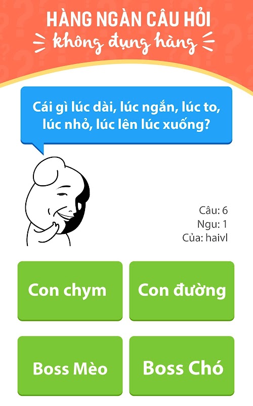 Hỏi ngu - Hỏi Tí - Đáp Troll (Hoi ngu - Hoi Tí - Dap Troll) là game troll với kho câu hoi ngu vô cùng đa dạng giúp bạn rèn luyện khả năng hoi dap ứng biến với những câu hỏi ngu để trở thành thánh troll khi bị hỏi troll.