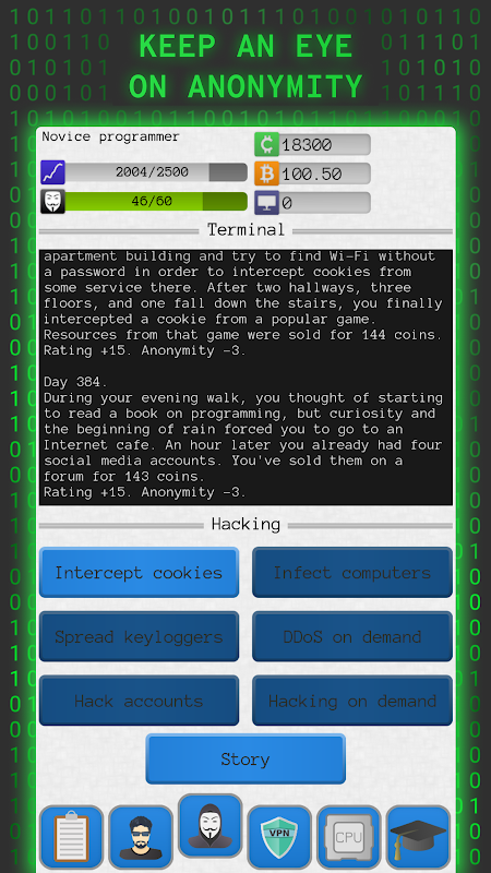 您想統治黑客世界嗎?學習課程並進行大規模的DDoS攻擊!完成各種訂單,提高您的評級,並獲得比特幣!通過在日常工作中恢復匿名來擺脫所有懷疑!