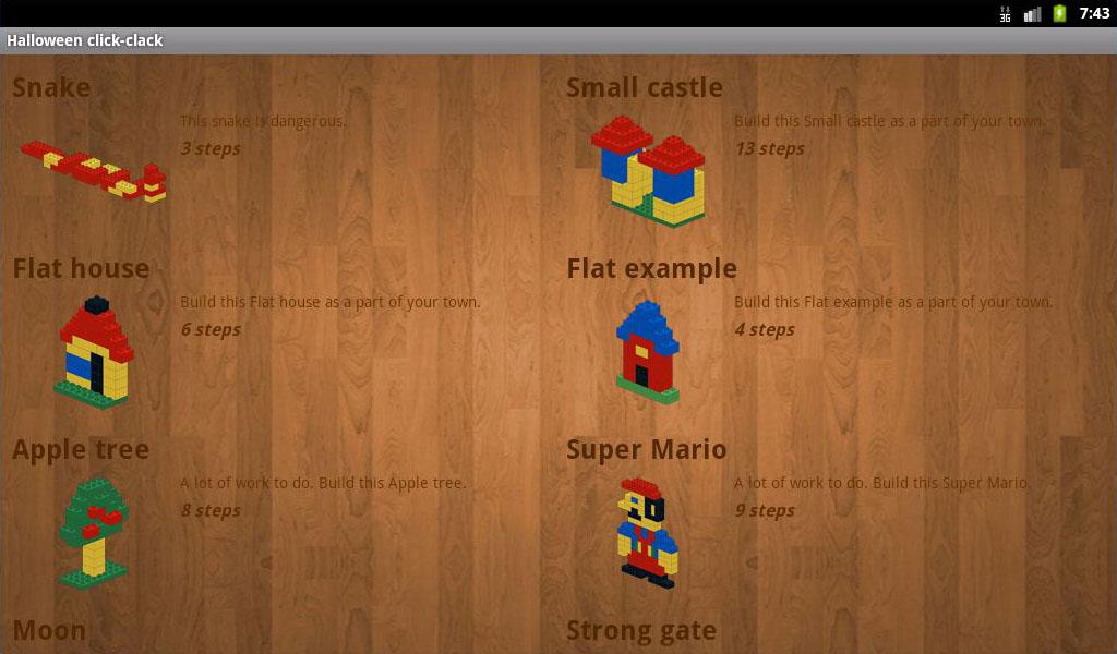 這些遊戲旨在玩彩色互鎖塑料積木玩具。這些砌塊可以以多種方式組裝和連接,以構建諸如車輛,動物,建築物甚至工作機器人之類的物體。任何構造的東西都可以再次拆開,這些碎片可以用來製作其他物品。