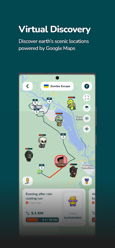 參與者可以在虛擬地圖中同步他們的鍛煉,例如步數、步行、跑步或騎自行車,並與穀歌提供的街景視圖同步。