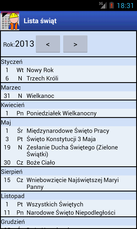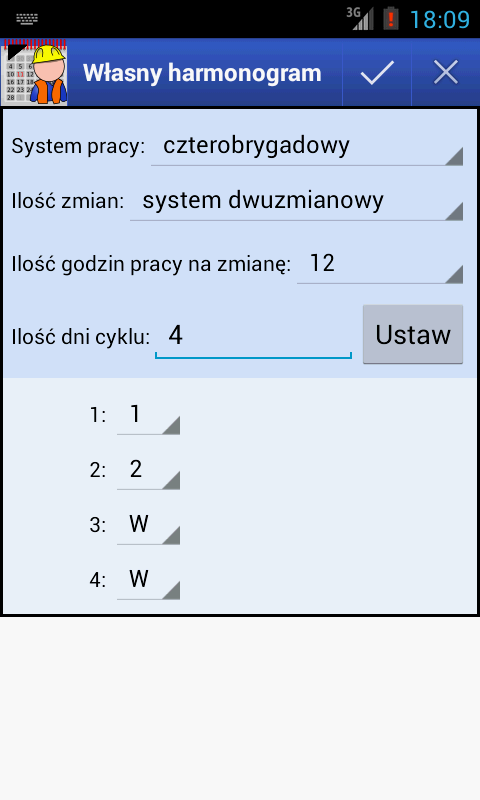 在程序設置中,為單個旅定義工作系統的類型和周期的開始日期(對於A,B,C,D和E旅(五個旅),第一班的第一天開始)。基於這些數據,程序將計算工作計劃。