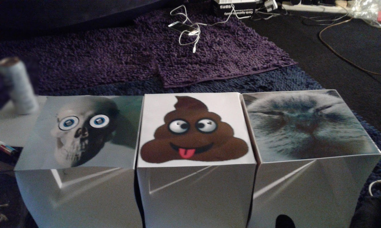 It's all just silly dma-ness !-) Use your phone's camera or gallery to apply pictures to the five sides of a "Head-Box", email the result to your own PC, print them out on A4, stick them together, and plonk it on your noggin! Yes, personalised flat-pack heads !-)