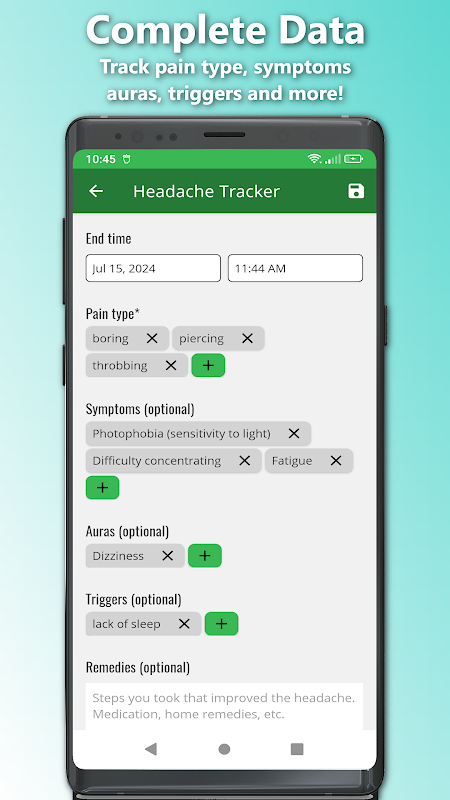 - 輕鬆記錄:記錄頭痛詳細信息,例如持續時間、嚴重程度、疼痛位置、疼痛類型和觸發因素。