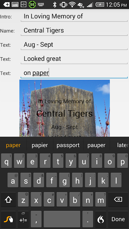 Enter the text and the app places it on the headstone.