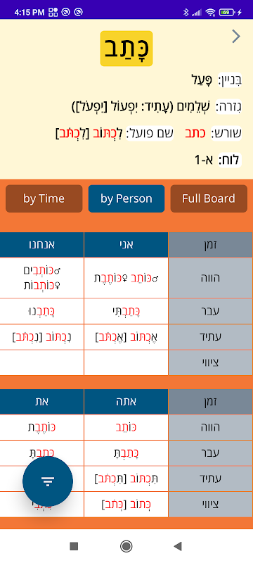 動詞表是正確學習希伯來語基礎知識的重要且必不可少的工具。迄今為止,已經發布了相當多的動詞表,但是我們相信這個應用程序為用戶提供了一種更複雜和現代的方法。首先,目標是為希望提高對動詞變位理解的希伯來語學習者創造獨特的高質量產品。該應用程序的許多語法和視覺功能不僅旨在提供用戶友好的界面,而且還可以作為一個完整且有效的教育工具。