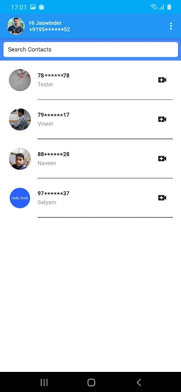 您可以使用您的手機號碼進行註冊並通過OTP進行驗證,您將看到服務器上註冊的所有聯繫人,並且可以與任何人進行視頻通話。