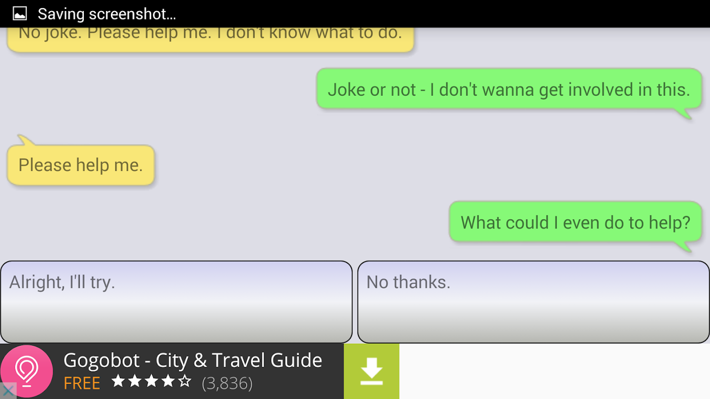 幫助吉姆是一個文字冒險遊戲。這是一個可玩,分枝故事,你的反應決定接下來會發生什麼。盡你最大的努力幫助吉姆和他只是可能逃脫。遊戲的風格模仿短信應用程序。故事可以通過多條路徑中完成,所以它值得多個重播。它就像一個電子“選擇你自己的冒險”的遊戲。